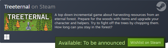A top down incremental game about harvesting resources from an eternal forest. Prepare for the woods with items and upgrade your character and helpers. Try to fight off the trees by chopping them. How long can you stay in the forest?